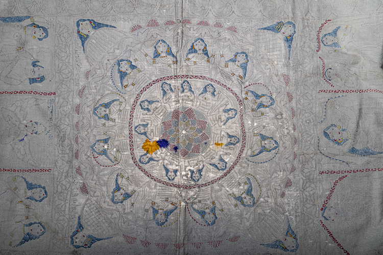Detail of a semi transparent Kantha, 19th C, undivided Bengal, under backlighting. Gift of Banoo and Jeevak Parpia to the MFAH.